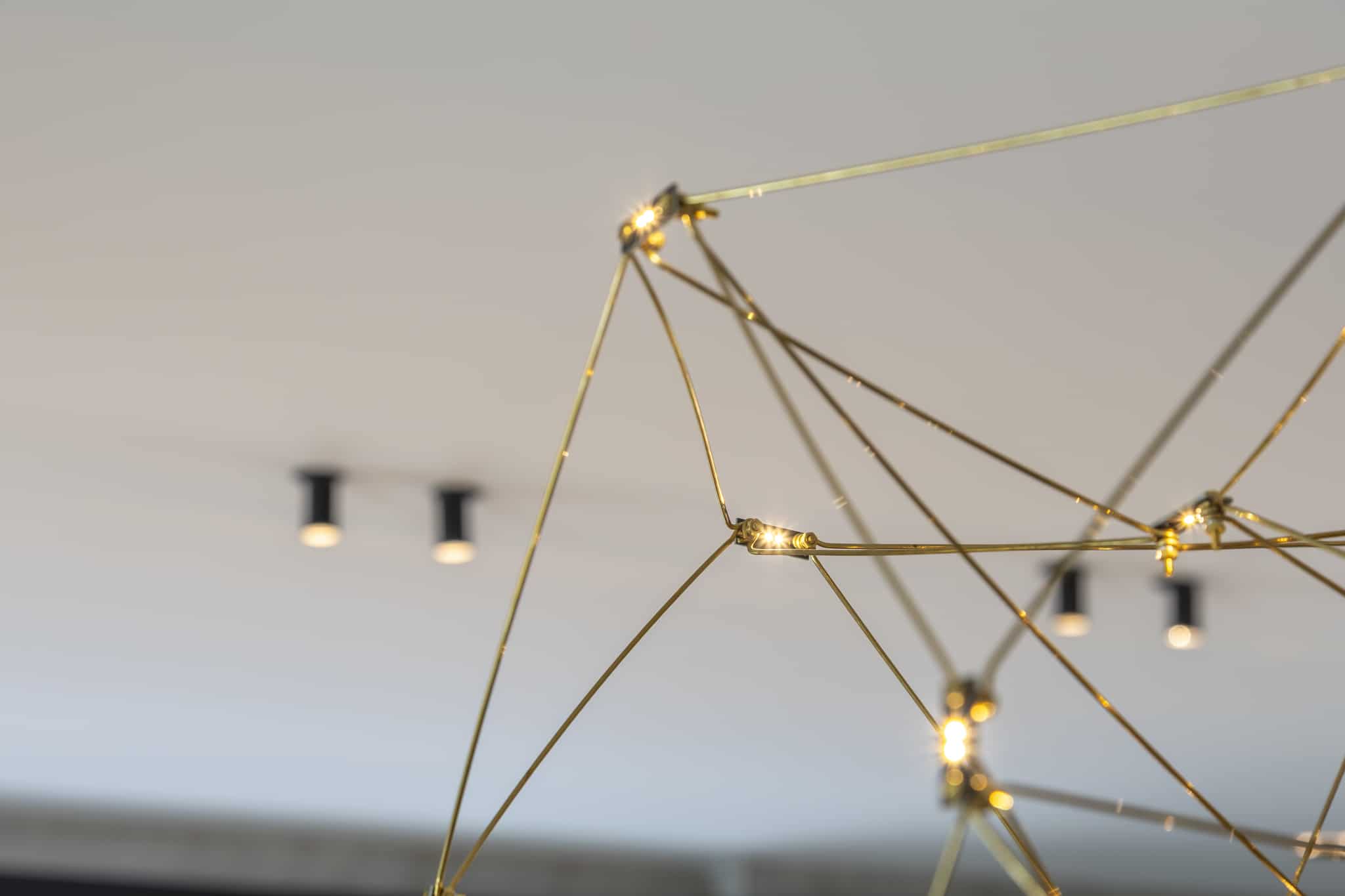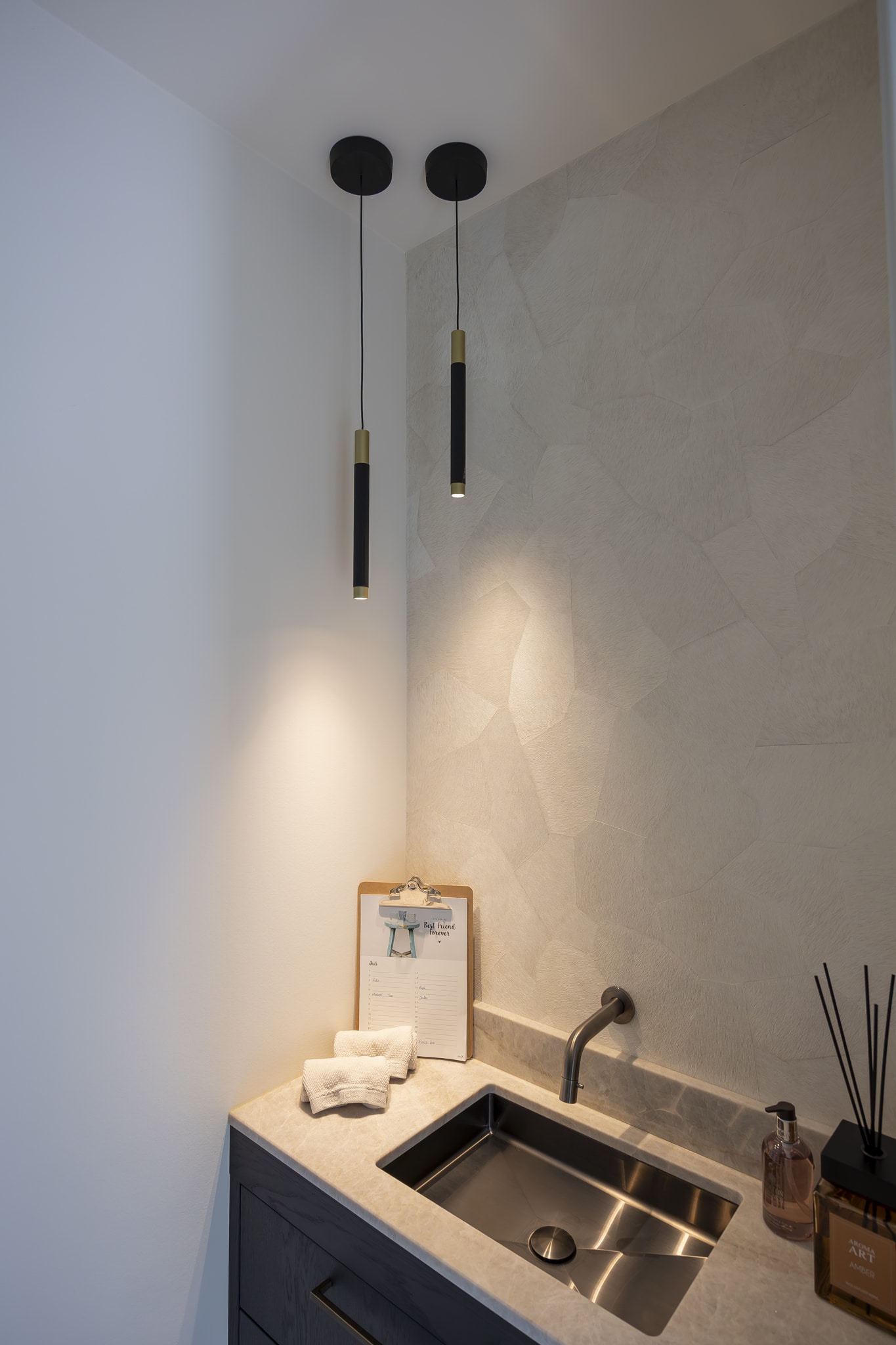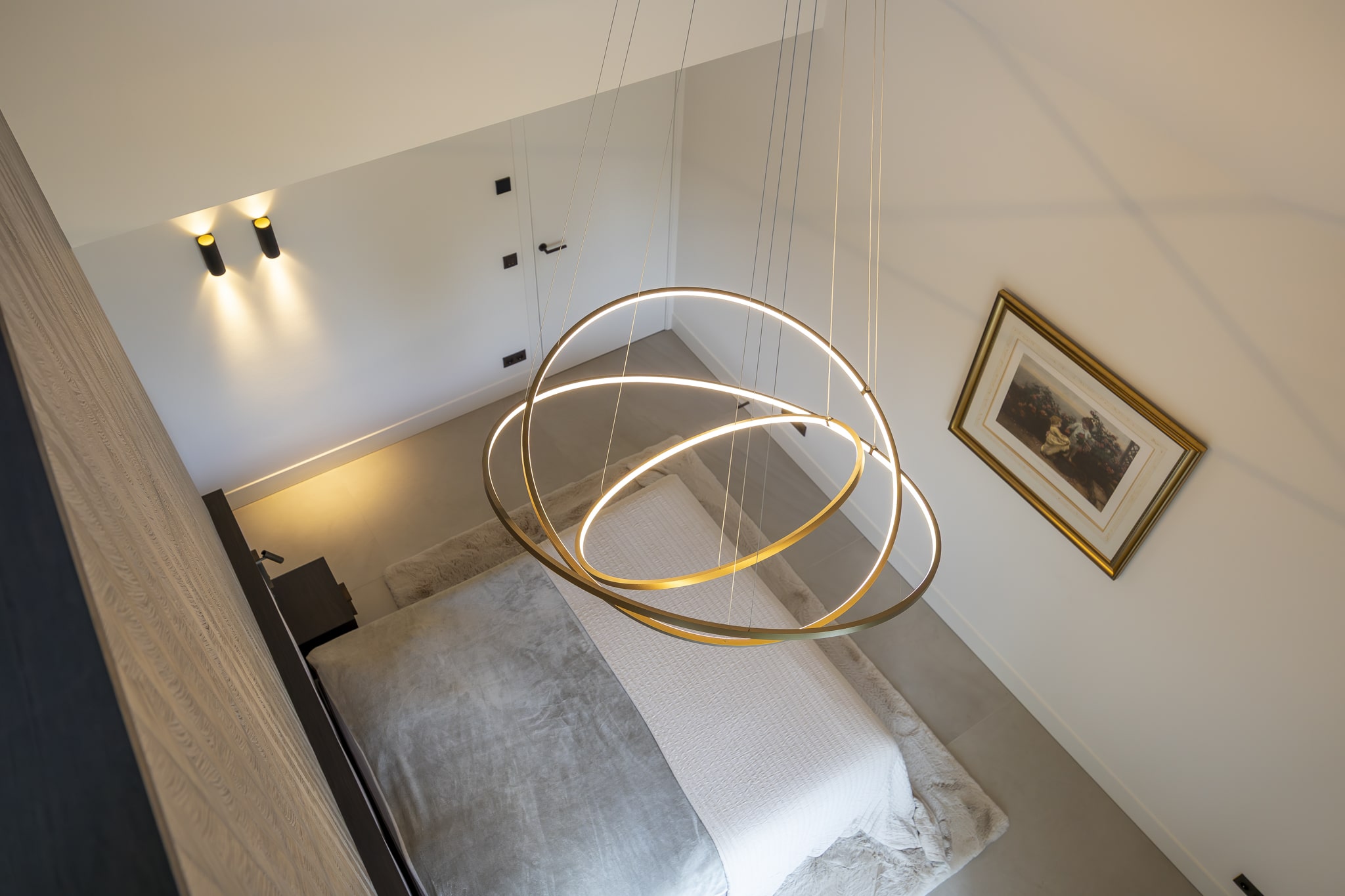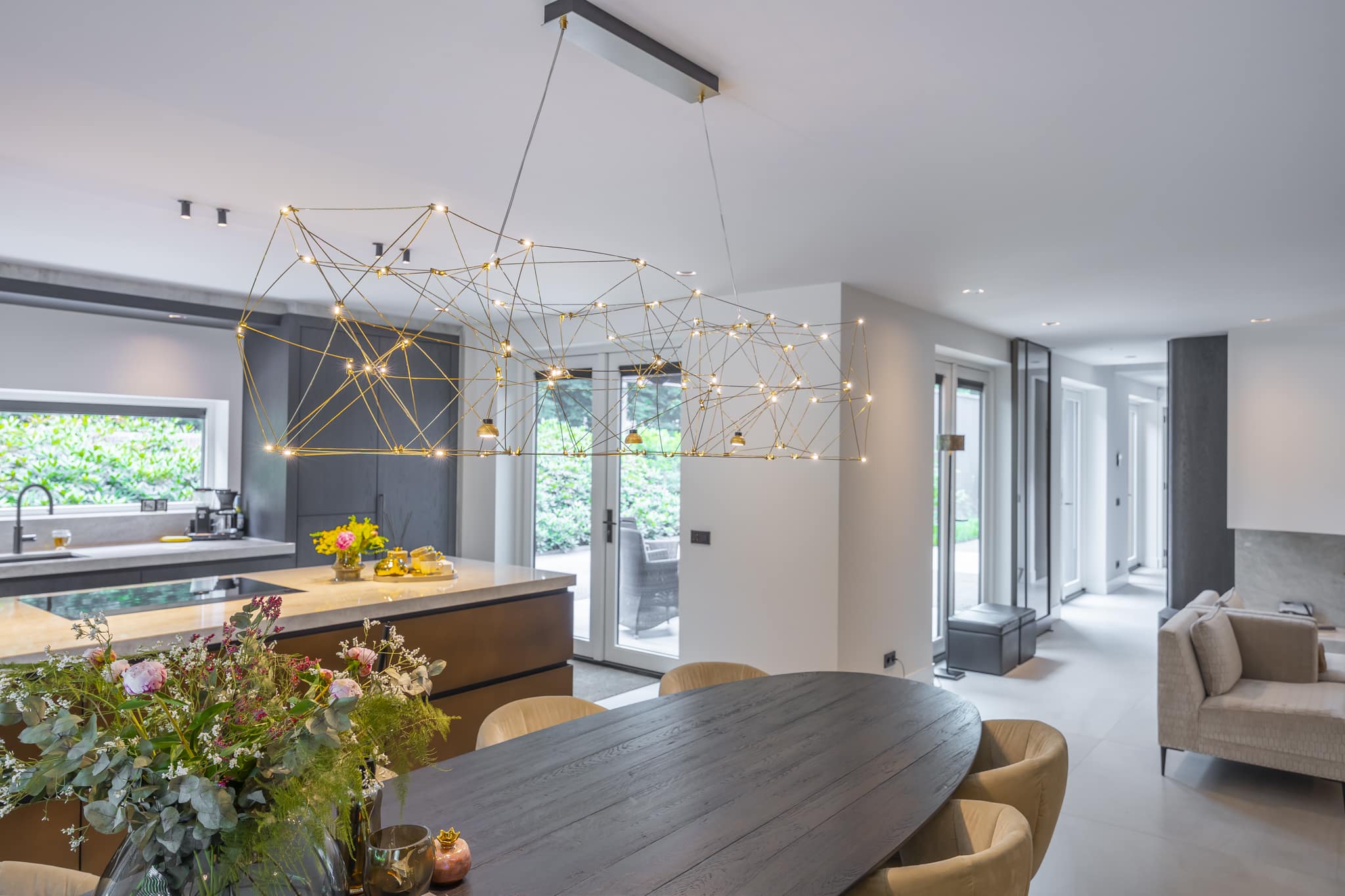 Voor deze nieuw gebouwde villa hebben we een lichtplan ontworpen passend bij de stijl van het huis en de wens van de bewoners. Het resultaat is een combinatie geworden van prachtige warme kleuren in brons, messing en zwart met als eyecatcher de messing hanglamp van Quasar boven de eettafel.