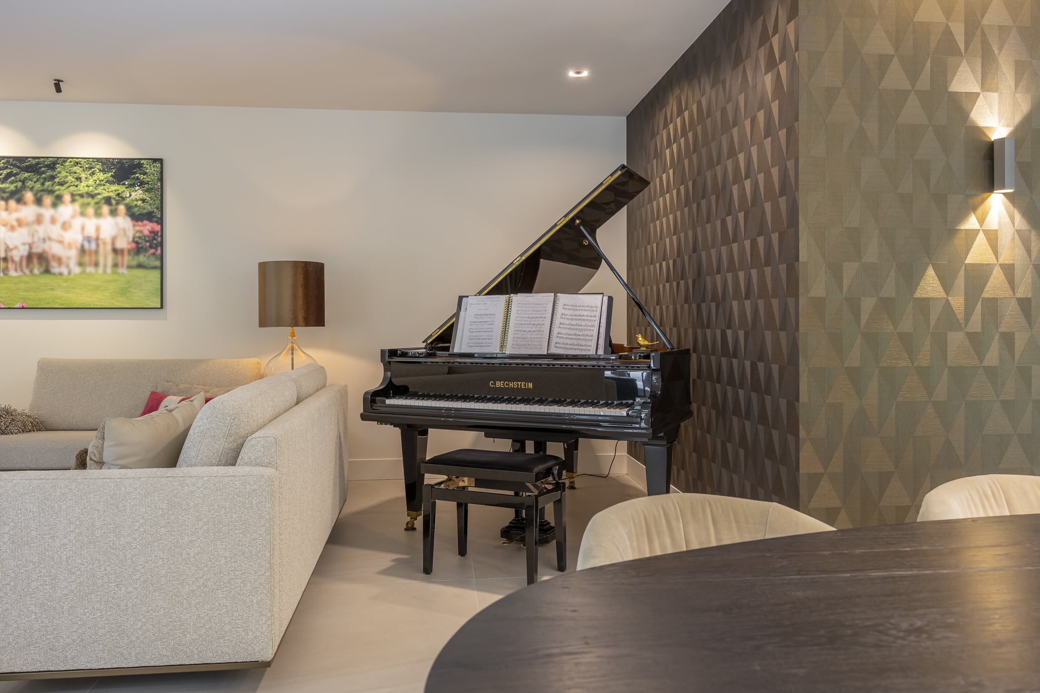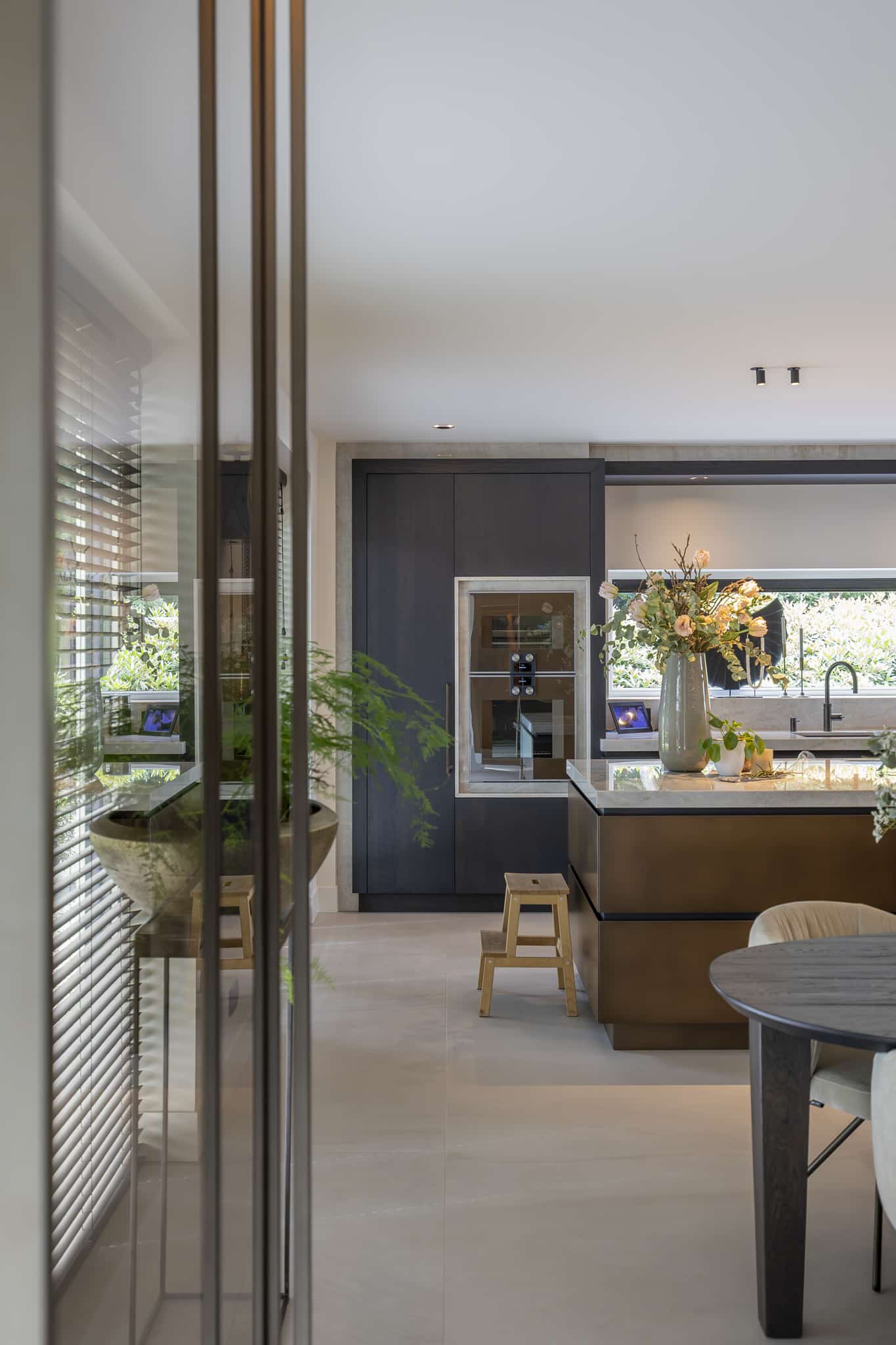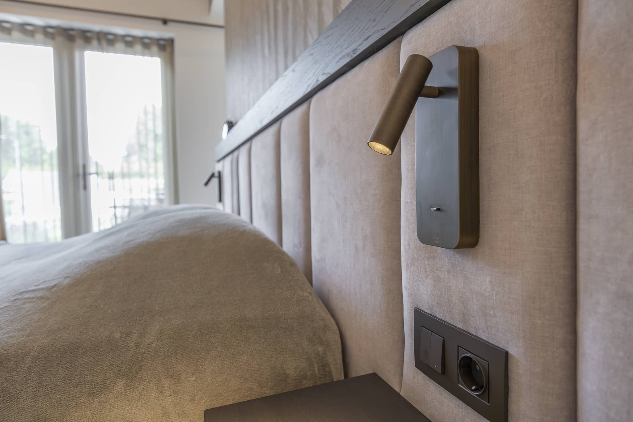 Voor deze nieuw gebouwde villa hebben we een lichtplan ontworpen passend bij de stijl van het huis en de wens van de bewoners. Het resultaat is een combinatie geworden van prachtige warme kleuren in brons, messing en zwart met als eyecatcher de messing hanglamp van Quasar boven de eettafel.