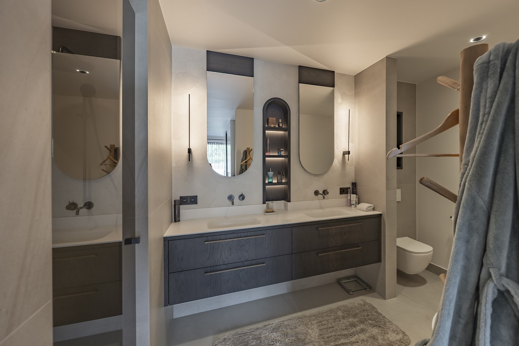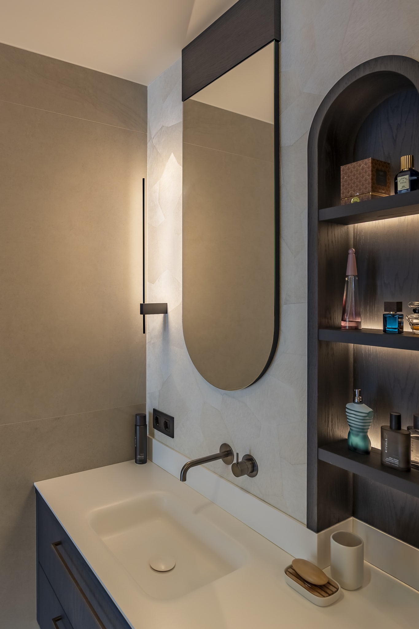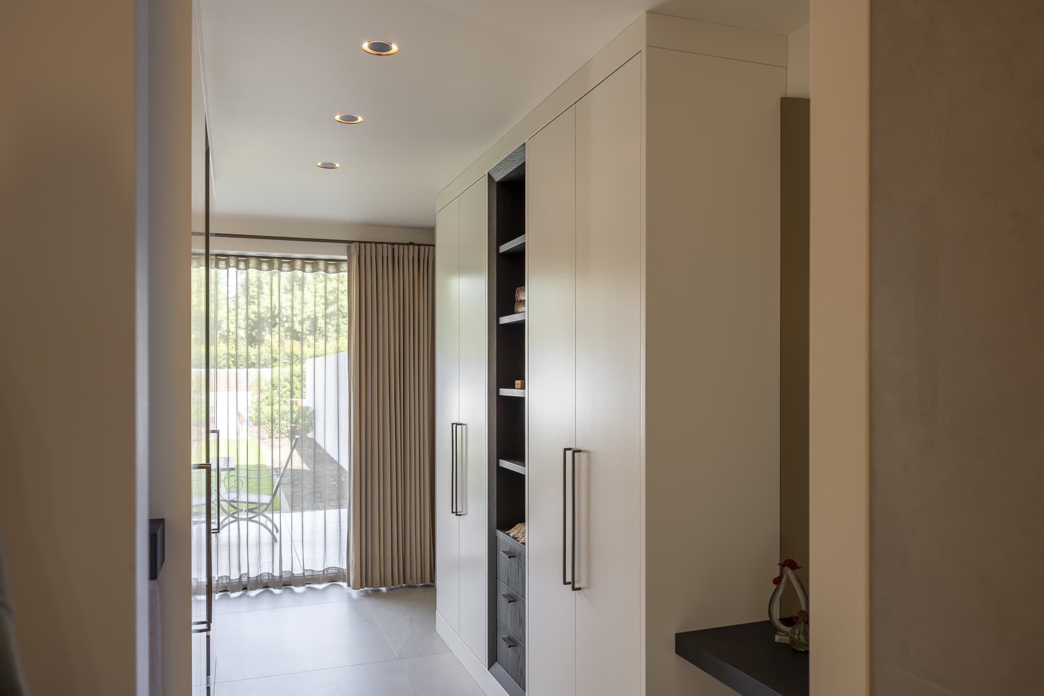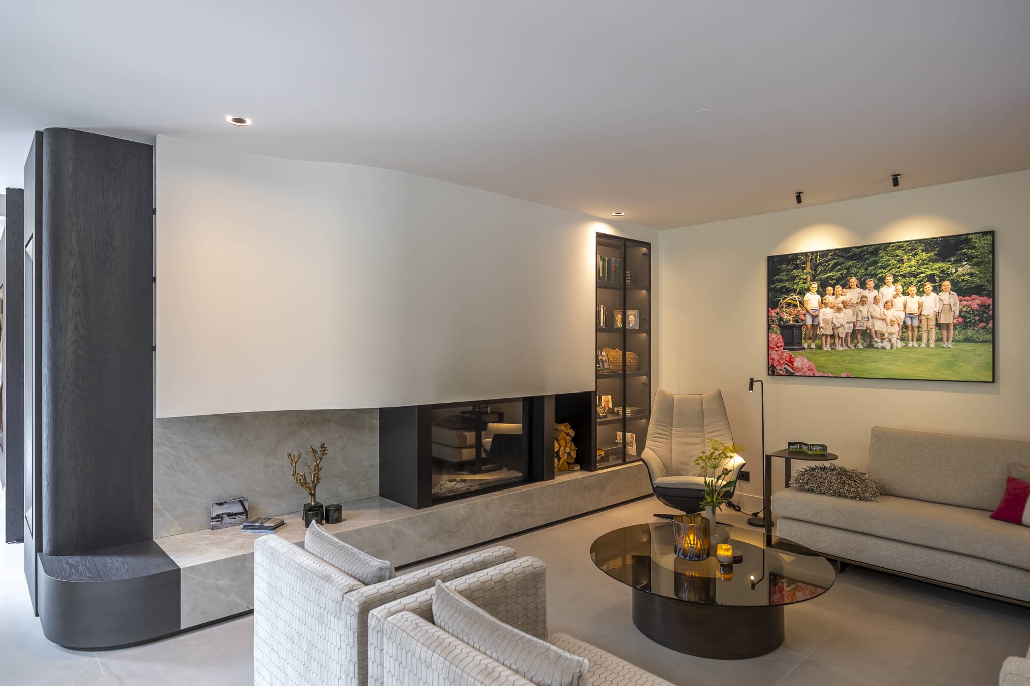 Voor deze nieuw gebouwde villa hebben we een lichtplan ontworpen passend bij de stijl van het huis en de wens van de bewoners. Het resultaat is een combinatie geworden van prachtige warme kleuren in brons, messing en zwart met als eyecatcher de messing hanglamp van Quasar boven de eettafel.