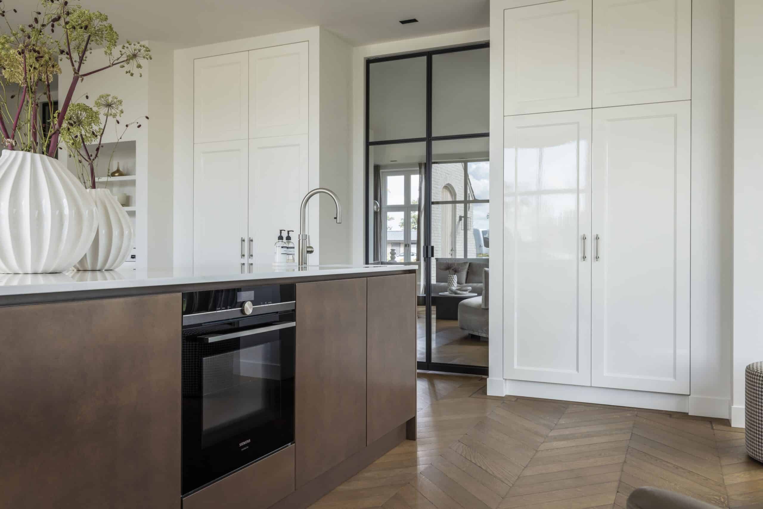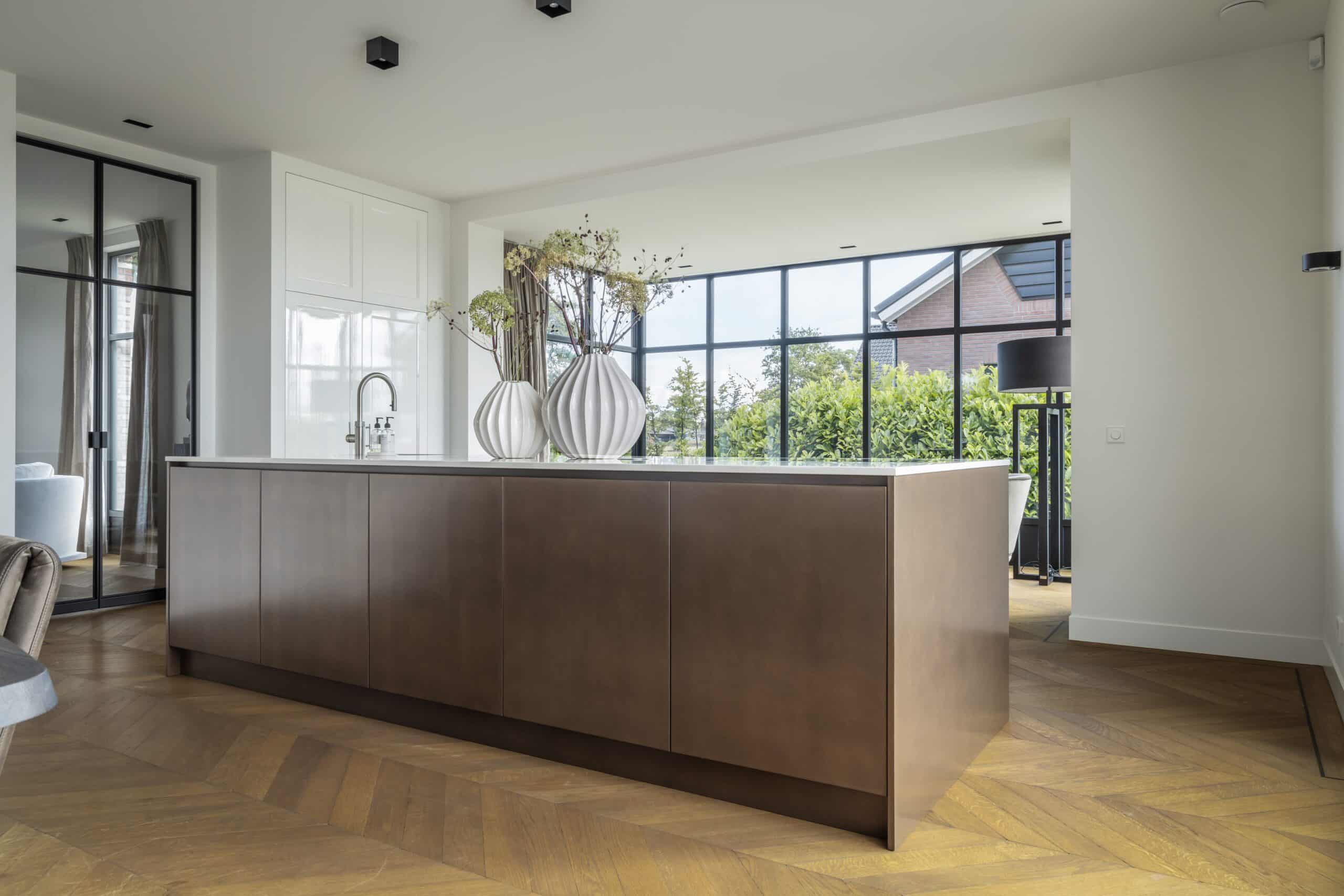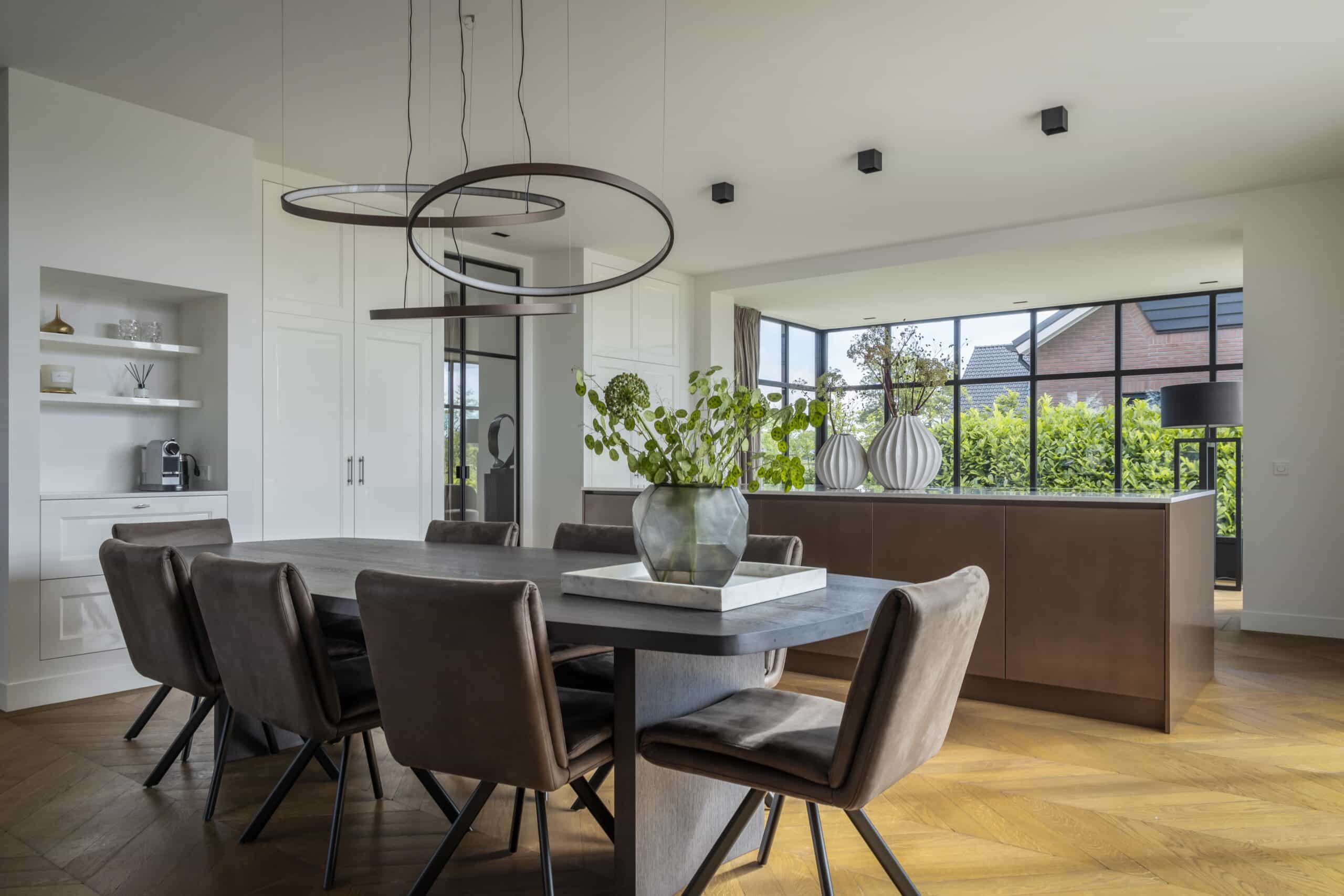 Voor de woning gebruikten we vierkante trimless inbouwspots, gecombineerd met de opbouw versie voor boven het keukeneiland. De hanglampen en wandlampen in de warme brons kleur zorgen voor een sfeervol geheel in deze woning.